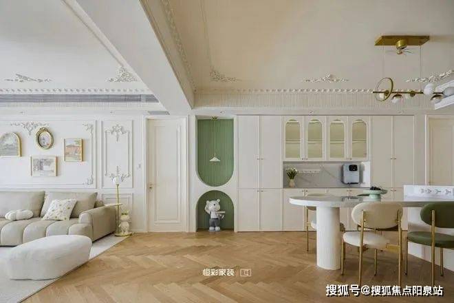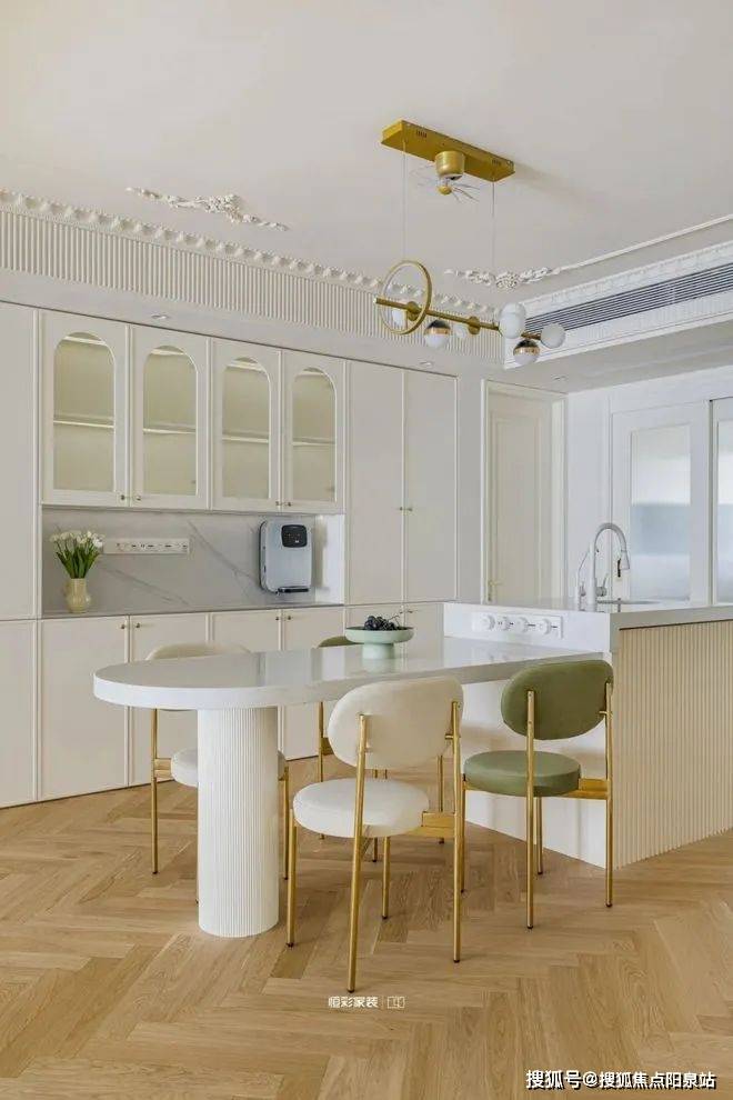 餐厅带点艺术感与轻奢感,让人现时一亮。地面通铺胡桃木人字拼地板,墙面都是温柔的奶白,由餐厅望向客堂,似珍珠奶油般的精巧明亮,合座空间温顺灵动。