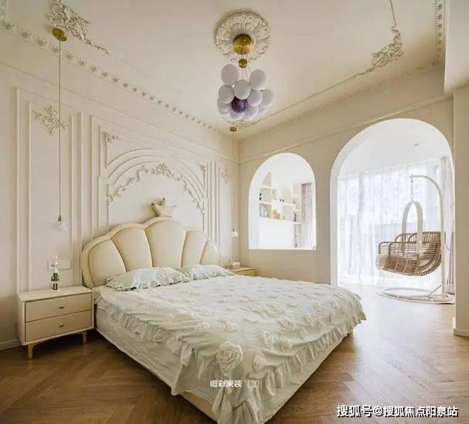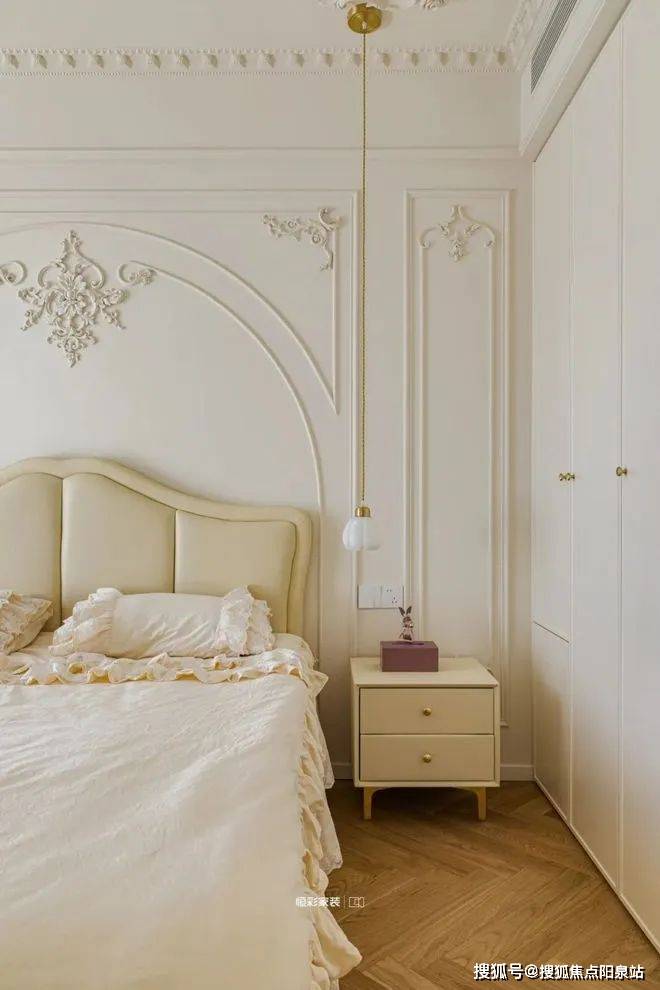 主卧同样没有过多的颜色碰撞,合座看起来明亮纯粹。后台墙以对称的奶白色石膏线搭配雕花粉饰,温柔又贵气,客堂同款花瓣水晶灯超美。床头两盏对称金属南瓜吊灯垂下,让人忍不住重迷正在这一片安宁之中。