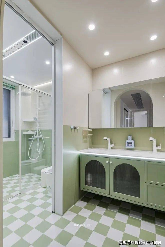 常见的灰色系瓷砖容易显得暗重,墙砖地砖都选用了几何图案的幼花砖,满满的奶油调调,一绿一白,合座灵动烂漫,衬得特地崭新舒畅,颜值超高。