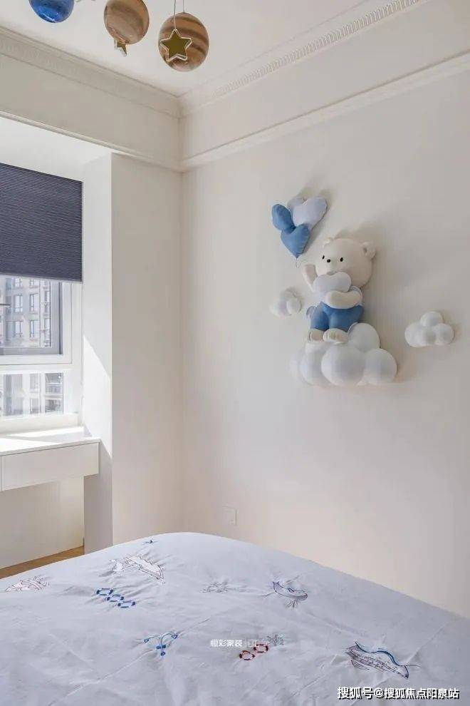 儿子房采光很棒,厉重是知足憩息+文娱+收纳效用,星球吊灯相等吸睛,再搭配云朵幼熊的墙壁挂件,给孩子营造一个童真童趣的运动空间。