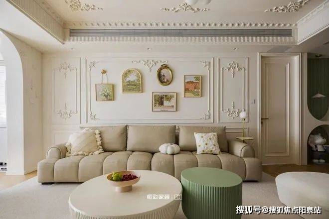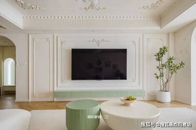客堂阳台买通后通铺木地板连结空间连贯性,硬装上绝对团结的选色与复古线条,软装上挑选糯叽叽肥嘟嘟的造型,圆润的边角带来更多奶油感,看上去更具温顺感。