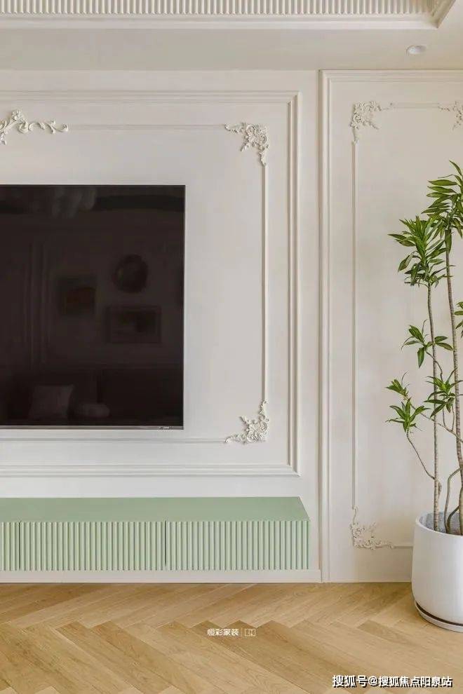 电视后台墙侧边以对称石膏线粉饰,另一侧绿植的出镜更添几分生趣儿,传达出的格调,也是奶油风所独有的治愈系温顺。吊顶处以模范钢琴线与角花粉饰,尽是浓浓的模范奶油气氛感。